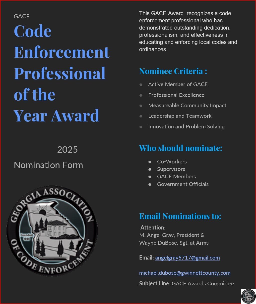 This GACE Awardย recognizes a code enforcement professional who has demonstrated outstanding dedication, professionalism, and effectiveness in educating and enforcing local codes and ordinances.